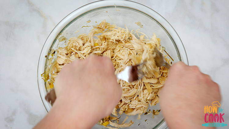 - Once the chicken is fully cooked through, remove and shred, then place back in the slow cooker. Add the cream cheese and heavy whipping cream and stir until thoroughly incorporated. Serve hot with preferred toppings