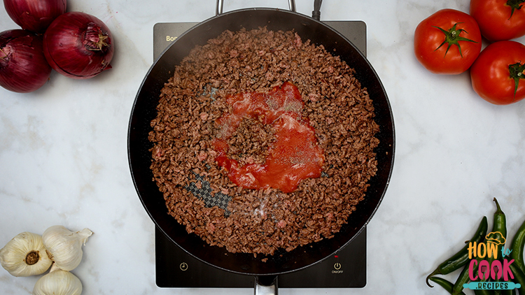 You’ll heat vegetable oil in a nonstick skillet and brown the beef. Then add tomato sauce and seasonings, cooking for about 5 to 7 more minutes until it’s ready to serve.