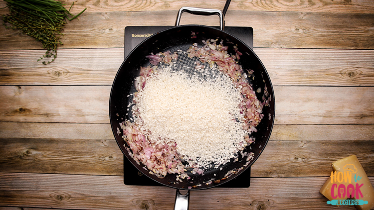 First, you’ll heat the broth up and set it aside when it’s warm. Then in a large saucepan, you’ll heat the oil so it’s hot, then cook the mushrooms. Once they’re soft, set them aside, then add more olive oil to cook the shallots. After about 2 minutes, add the arborio rice in and coat every last grain so it toasts to a golden color. When the arborio rice is golden, add the wine until the rice fully absorbs it. Then add the chicken stock slowly, waiting until it absorbs before adding more. Once you’ve finished adding it all and the rice is al dente, roughly 20 minutes, you can take it off the heat. Add the mushrooms, butter, chives, and cheese. Salt and pepper to your preference and it’s ready to serve.