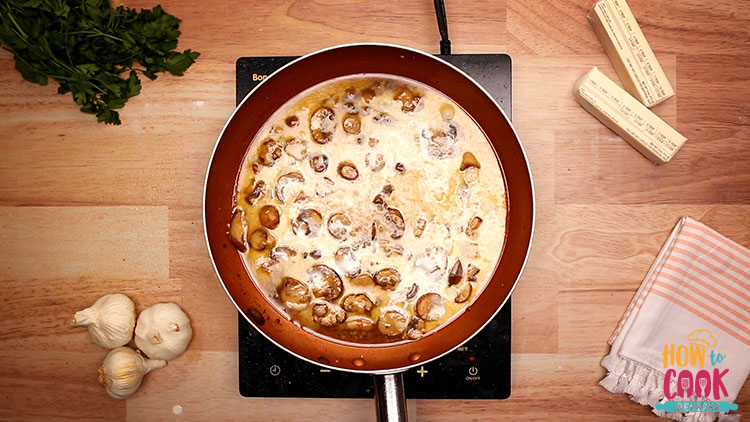 You’ll melt butter in the same pan you cooked the chicken, brown the mushrooms, and then add the garlic. After that, in goes the wine, chicken, and stock to simmer for about 15 minutes until thickened.