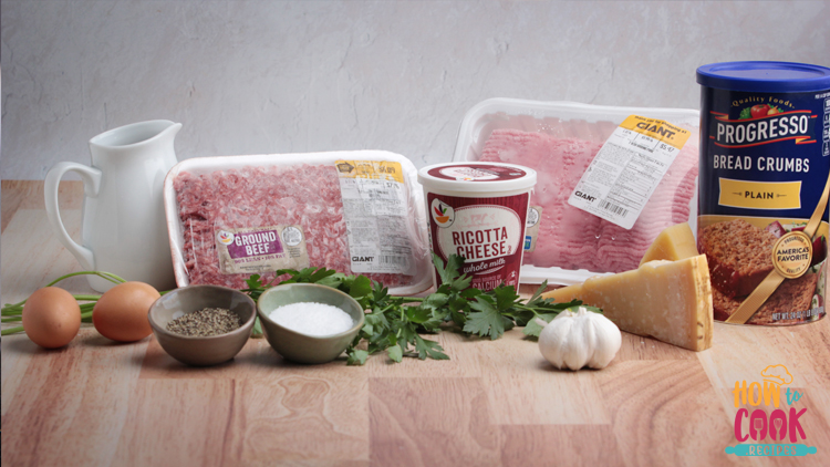 - In a large mixing bowl, mix together 1 lb ground beef and 1 lb ground pork. Add in the bread crumbs, ricotta cheese, parsley, two beaten eggs, parmesan, milk, and 3 cloves of minced garlic. Add in salt and pepper to taste. Mix well. (a food processor can also be used for this step)